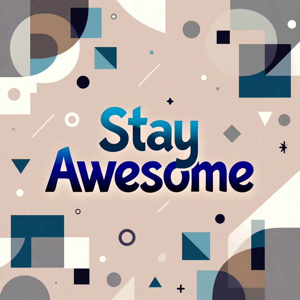 Vibrant geometric abstract background features overlapping circles, squares, and triangles in shades of beige, gray, teal, and blue. Bold text 'Stay Awesomeome' stands out in large, glowing blue letters at the center. Scattered stars and shapes add a dynamic, modern feel on a light tan backdrop.