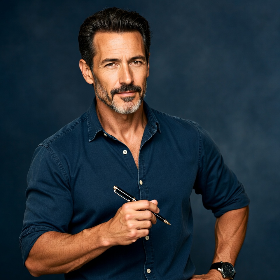 A mature man with short dark hair, mustache, and goatee stands confidently against a dark blue background. He wears a navy blue button-up shirt with the top buttons undone and holds a pen in his right hand. A silver watch adorns his left wrist, and his muscular arms are visible.