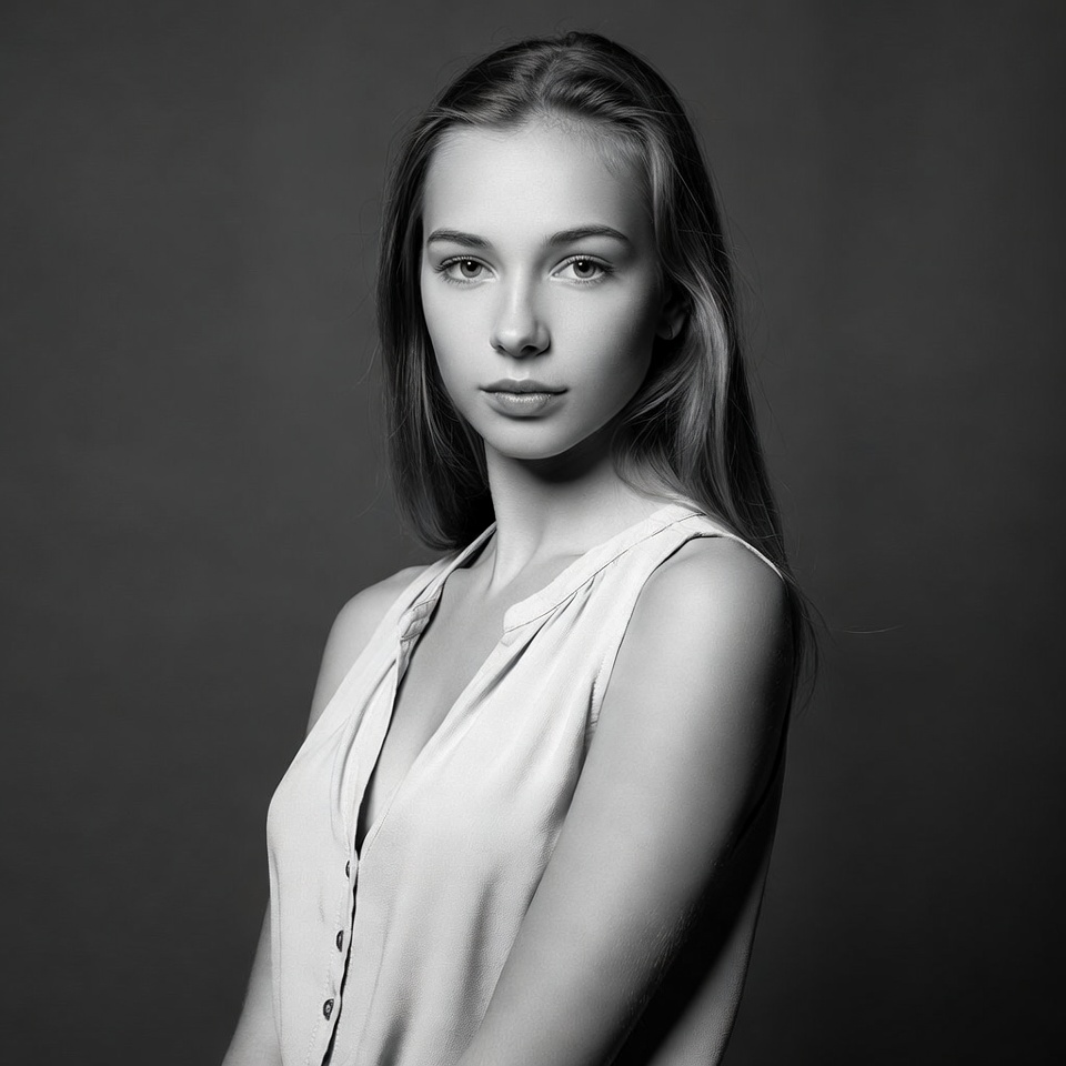 V-neck, White, beauty, black and white, buttons, dark background, elegant, fashion, female, gray background, headshot, long hair, monochrome, portrait, serious expression, sleeveless, slender, straight hair, studio portrait, tank top, white top, young woman, woman