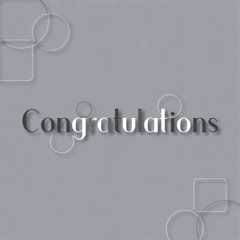 achievement message, celebration graphic, circles, elegant font, festive text, geometric shapes, gray background, minimalist design, overlay shapes, squares, text, transparent circles, white lettering, white squares, congratulations