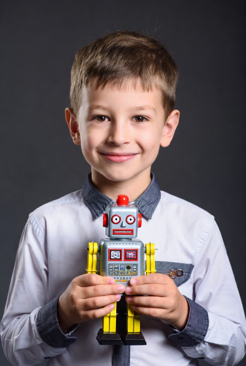 brown hair, child, collared shirt, happy child, holding robot, isolated background, mechanical toy, red eyes robot, robot toy, short hair, silver robot, smiling boy, studio photo, toy robot, white shirt, young boy, boy