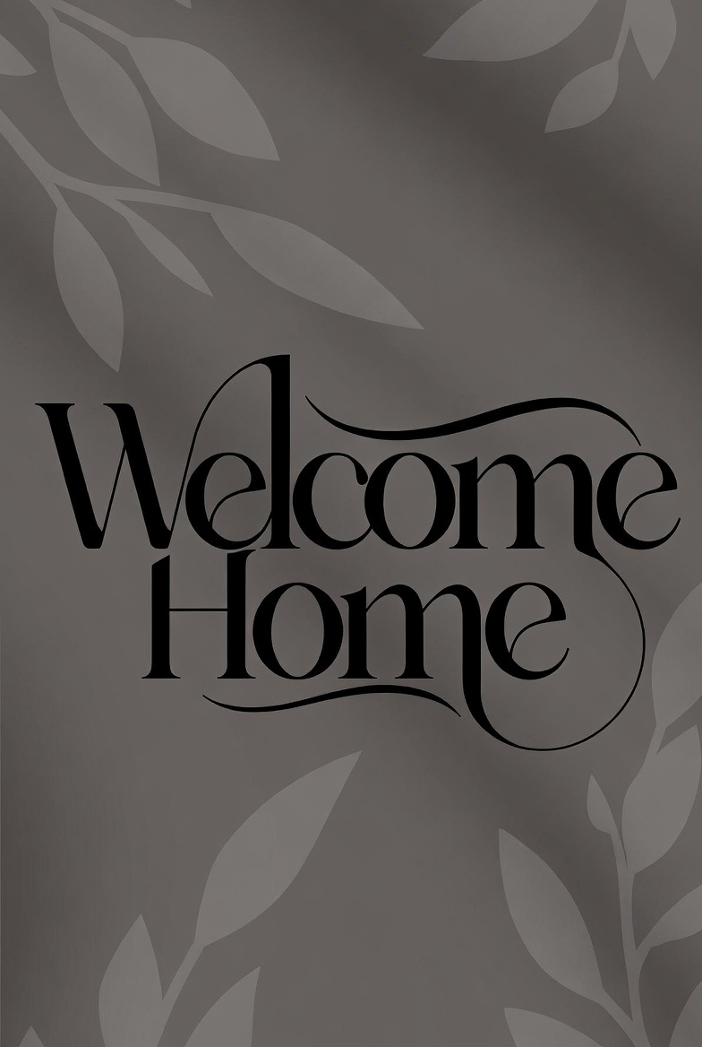 black text, cursive font, decorative text, elegant design, graphic, gray background, home decor, home sign, illustration, isolated background, leaf pattern, leaves, typography, welcome text, welcome home