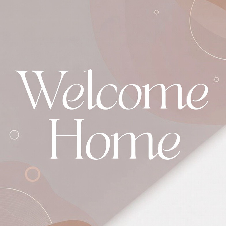 abstract design, beige background, cursive font, dots, gradient background, greeting card, home decor, home graphic, invitation design, minimalist graphic, modern design, organic shapes, pink shapes, typography, welcome text, white text, welcome home