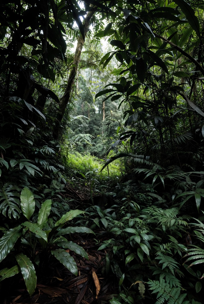 Amazon, broadleaf plants, canopy, dense trees, dirt path, expedition path, ferns, forest floor, green foliage, greenery, jungle, leaves, lush vegetation, misty, nature, rainforest trail, sunlight, trail, trees, tropical forest, tropical plants, undergrowth, wilderness, woods, rainforest