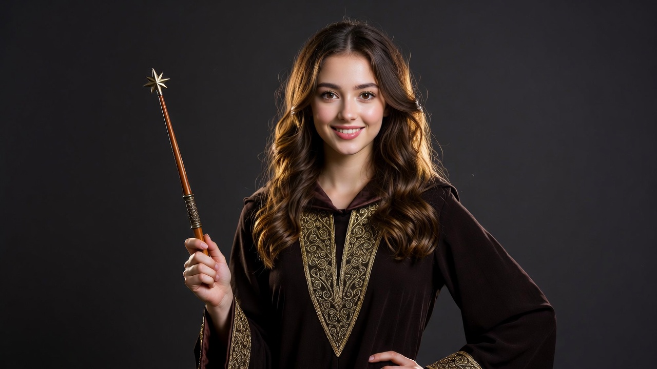 A young woman with long wavy brown hair smiles while holding a wooden magic wand with a star tip in her right hand. She wears a dark brown hooded robe with gold embroidery and stands confidently with her left hand on her hip. The image features a plain black background.