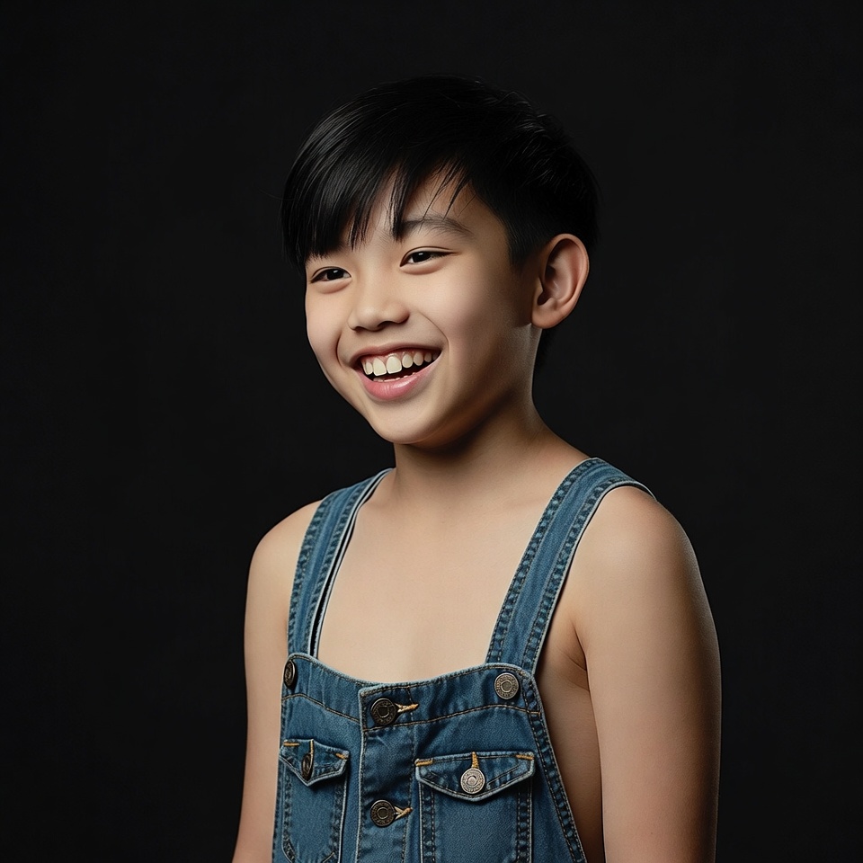 A young Asian boy with short black hair smiles happily at the camera against a black background. He wears sleeveless blue denim overalls with visible straps and buttons over his bare shoulders. His face shows bright eyes and a wide grin.
