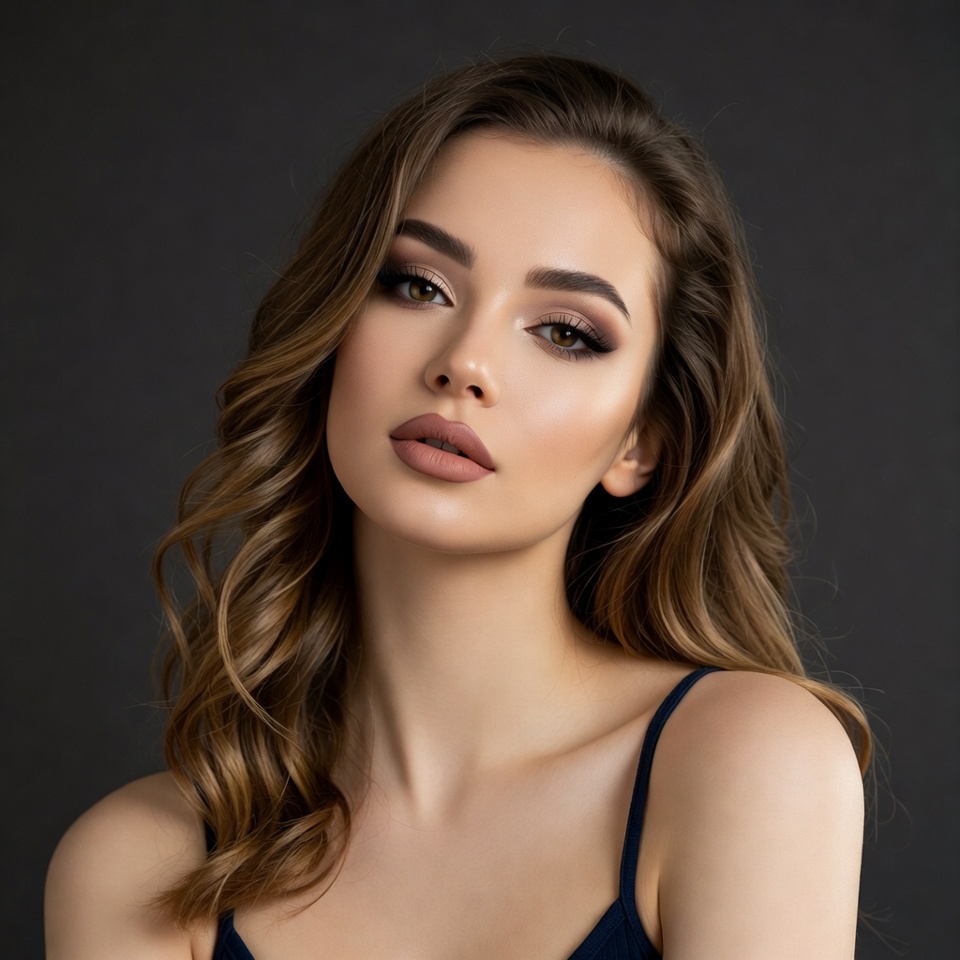 A young woman with long wavy brown hair gazes at the camera with a subtle smile. She has striking makeup with smokey eyes and nude lips, wearing thin black spaghetti straps. The portrait is set against a dark background, highlighting her facial features and elegant neckline.