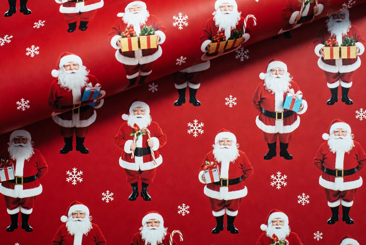 Red wrapping paper features a repeating pattern of illustrated Santa Claus figures standing and holding gifts, presents, and candy canes. Each Santa has a white beard, red suit, black boots, and is surrounded by white snowflakes on the festive red background. The design is detailed with various poses of Santa carrying boxes and roses.