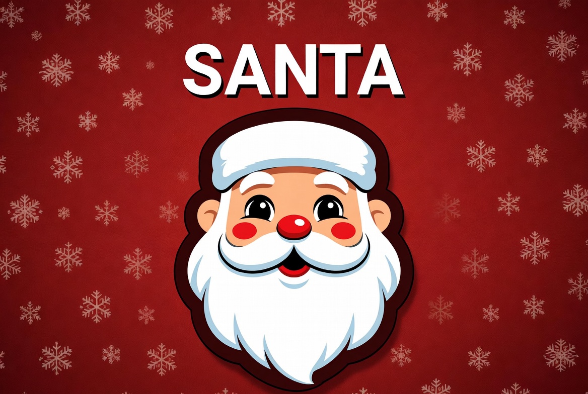 A cheerful cartoon illustration of Santa Claus's face with a white beard, red hat, and rosy cheeks. The design features bold outlines and a shiny red nose against a red background with white snowflakes. The word 'SANTA' is prominently displayed in white letters above the image.
