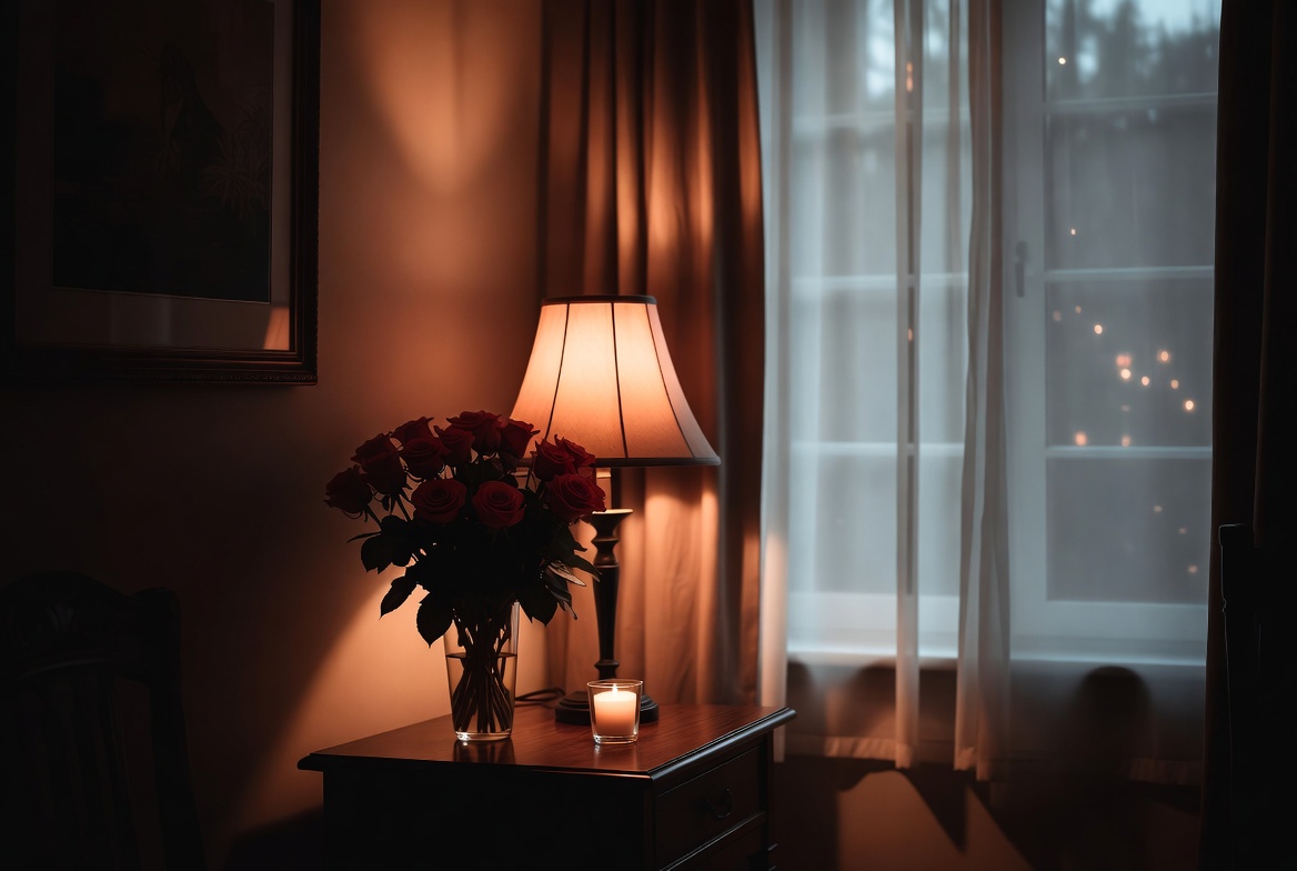 bedroom, bouquet, candle, cozy room, curtains, fabric shade, flowers, glass vase, interior, lamp, night lighting, nightstand, romantic decor, roses, sheer drapes, side table, warm light, window, wooden table, red roses