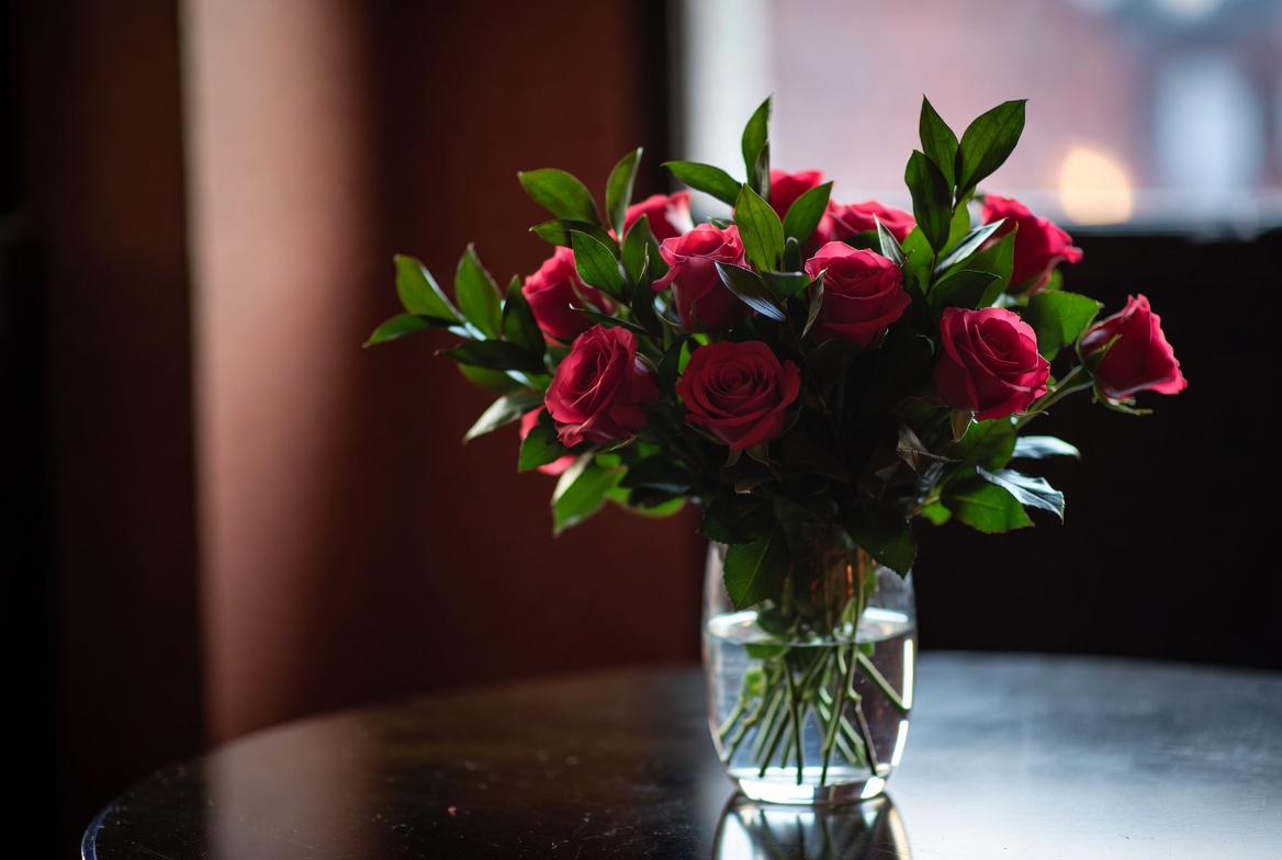 black table, bouquet, floral arrangement, flowers, fresh roses, glass vase, green leaves, indoor, red flowers, romantic flowers, roses, still life, table setting, warm lighting, water, window light, red roses