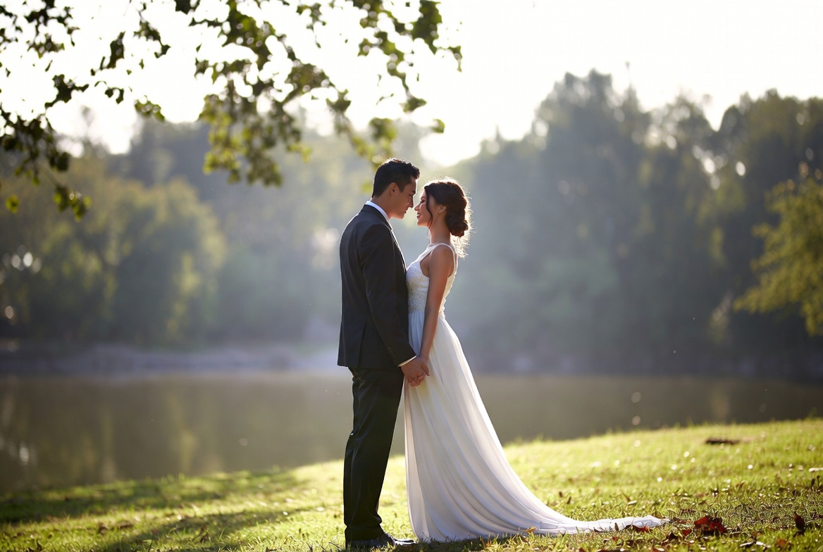 A bride in a flowing white gown and a groom in a dark suit stand closely together on green grass near a calm lake. They face each other affectionately with trees and soft sunlight in the background. The scene features a romantic outdoor setting with autumn leaves scattered on the ground.