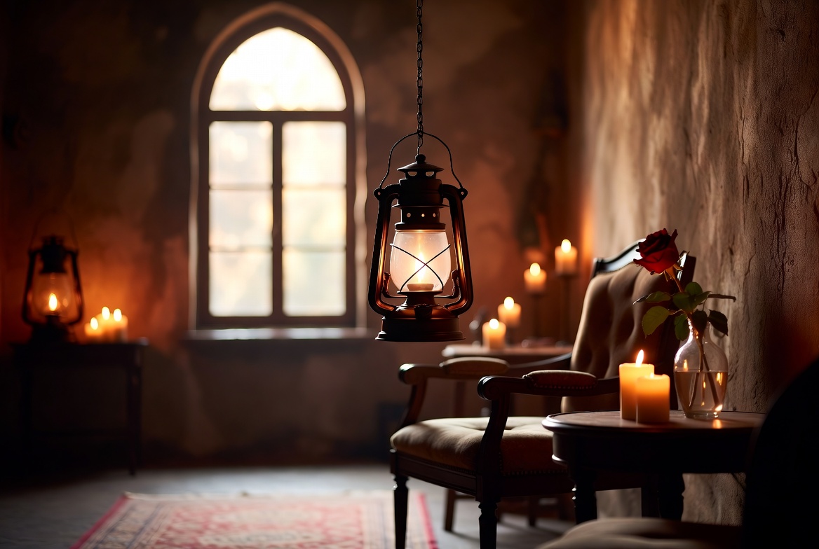 arched window, armchair, atmospheric interior, candle jar, candlelight, candles, cozy room, dim light, gothic room, hanging lantern, isolated background, old lantern, red rose, red rug, side table, stone walls, vase, vintage interior, warm lighting, wooden table, lantern