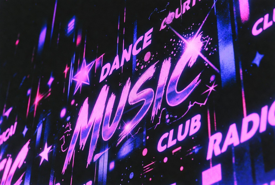 bold letters, club, dance music, digital art, disco, electronic music, futuristic, glowing text, illustration, nightclub, nightlife, party, pink neon, purple glow, radio, retro sign, starburst, stars, synthwave, vaporwave, neon sign