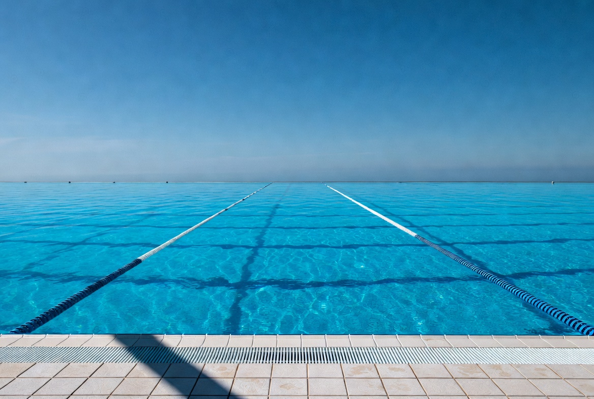 aquatic, blue sky, blue water, bright sky, clear water, empty pool, horizon, infinity pool, lane lines, lane ropes, outdoor pool, pool, pool edge, poolside, shadow, summer pool, swimming lanes, tiled deck, water sport, swimming pool