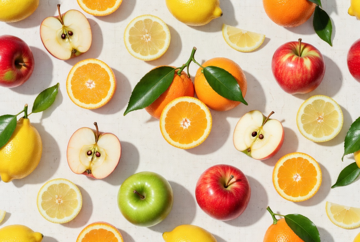 A flat lay arrangement of sliced apples, oranges, and lemons scattered on a white surface. Red, green, and yellow apples are shown whole and halved with visible seeds. Orange and lemon slices with green leaves add vibrant color contrast.