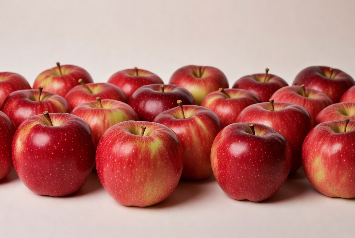 A pile of fresh red apples with green highlights is arranged on a plain white background. The apples vary slightly in size and shine, showcasing their smooth skins and stems. They are closely grouped together in a natural cluster.