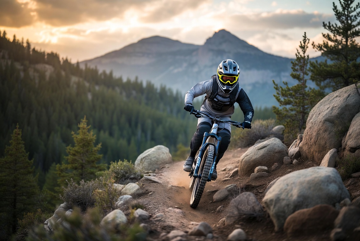 White, action shot, blue bike, boulders, clouds, cyclist, downhill biking, forest, full face helmet, golden sky, helmet, male, man, mountain bike, mountains, nature, outdoor adventure, pine trees, protective gear, rocky trail, snow capped mountains, sunset, trail riding, wilderness, mountain biking