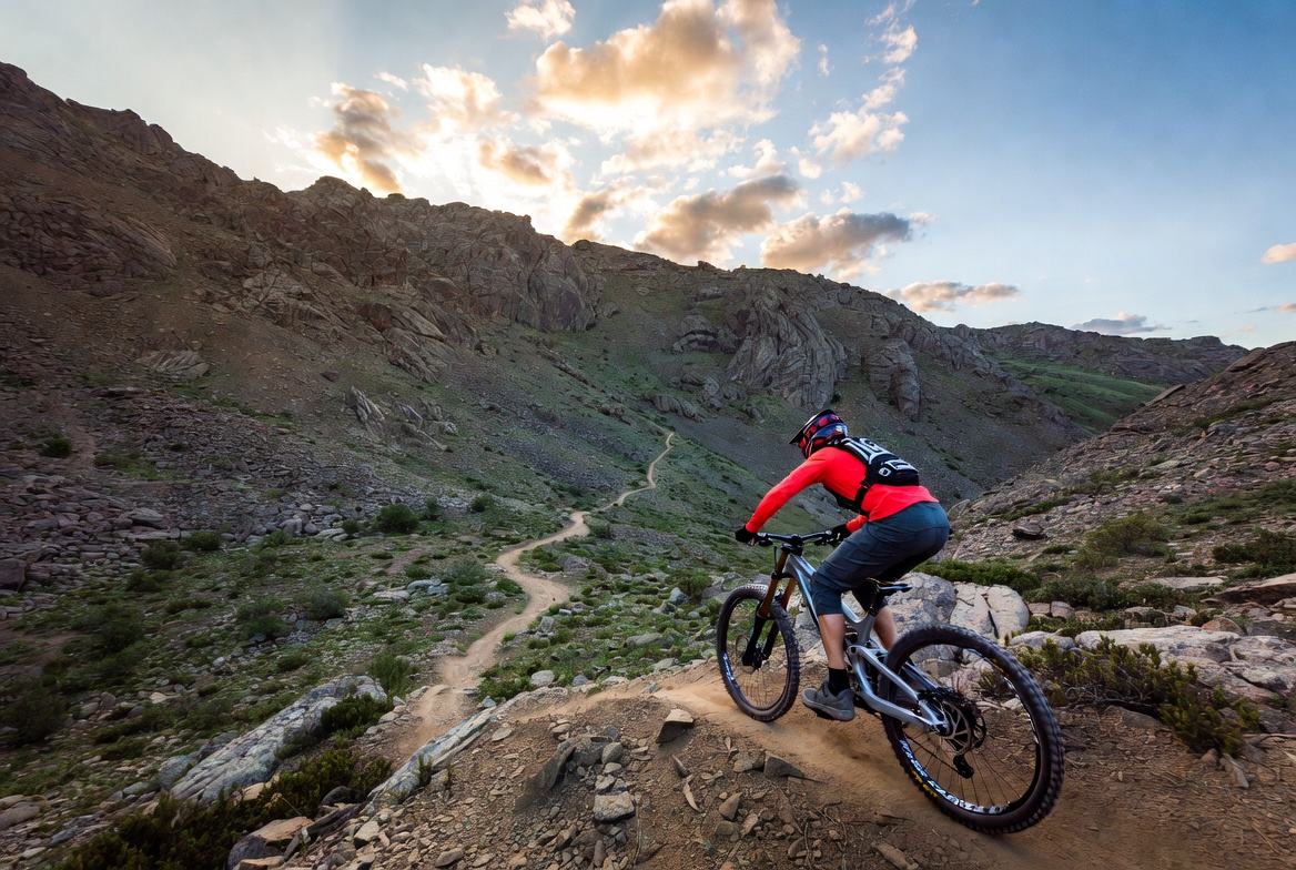 MTB, adventure, backpack, bike, cliffs, clouds, cyclist, downhill, female, helmet, mountain biking, mountains, nature, outdoors, path, red jacket, rocks, rugged terrain, shorts, sky, sunset, trail, wheels, woman