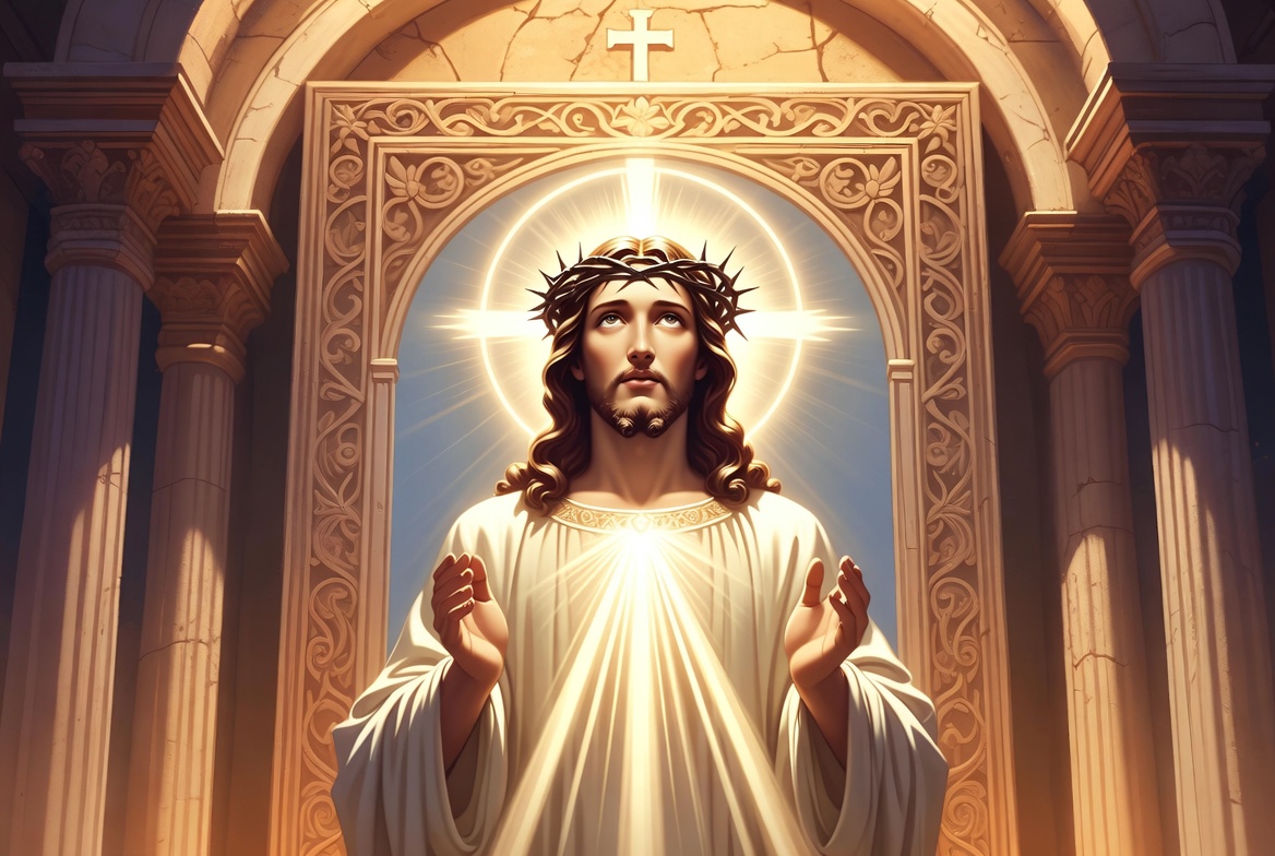 A digital illustration depicts Jesus Christ standing in a grand arched doorway with ornate columns. He wears a flowing white robe, a crown of thorns, and raises his hands with a glowing halo and radiant light emanating from behind. A wooden cross is visible above the golden archway.