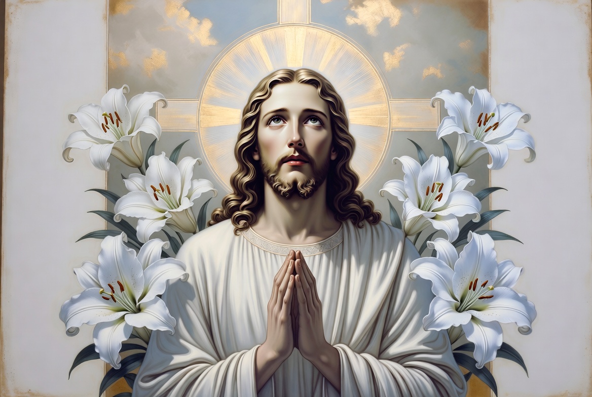 Christian art, Jesus, beard, clouds, cross, divine figure, faith, flowers, glowing halo, golden cross, halo, hands clasped, heavenly sky, illustration, lilies, long hair, prayer, praying, religious art, sacred image, spirituality, white lilies, white robe, worship, Jesus Christ