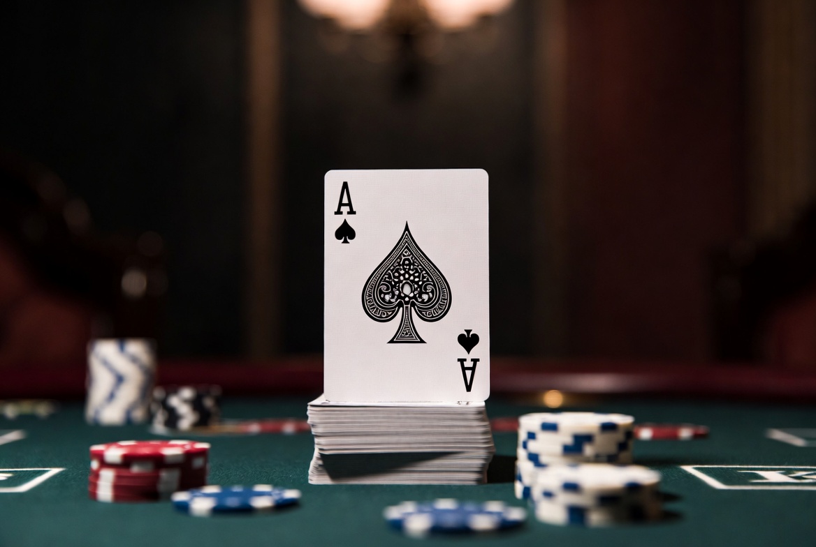 A white Ace of Spades playing card stands prominently on a green poker table. Surrounding it are stacks of colorful poker chips in red, white, and blue, along with a deck of cards. The background features a blurred luxurious room with warm lighting.