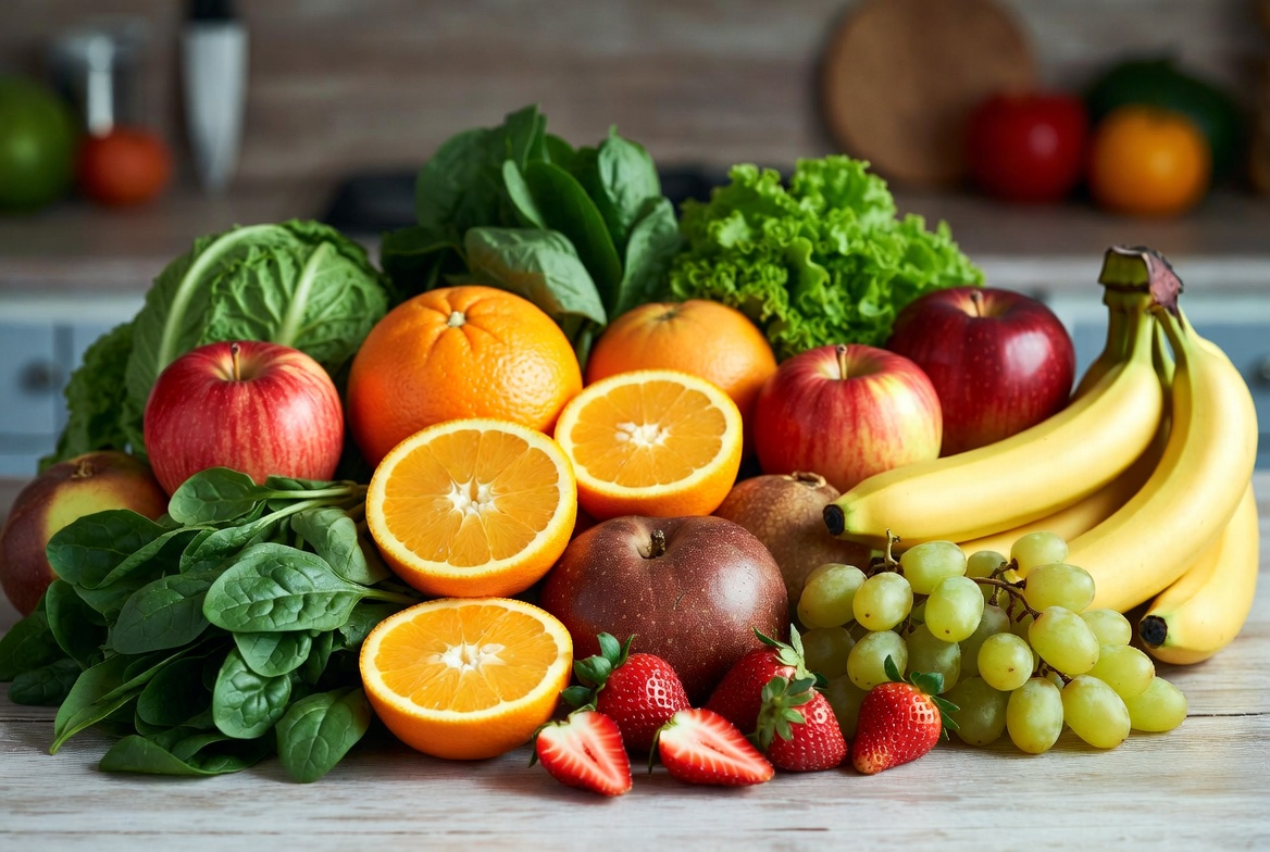A vibrant assortment of fresh fruits and vegetables is arranged on a wooden surface in a kitchen. Sliced oranges, red apples, bananas, grapes, strawberries, and whole apples are displayed prominently. Leafy greens like spinach, lettuce, and cabbage add color and freshness to the pile.