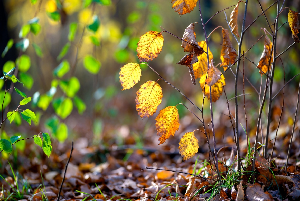 autumn, blurred background, brown stems, fall, fall foliage, foliage, forest background, forest floor, golden leaves, green leaves, leaf veins, leaves, natural light, nature, outdoors, stems, vibrant colors, yellow leaves, autumn leaves
