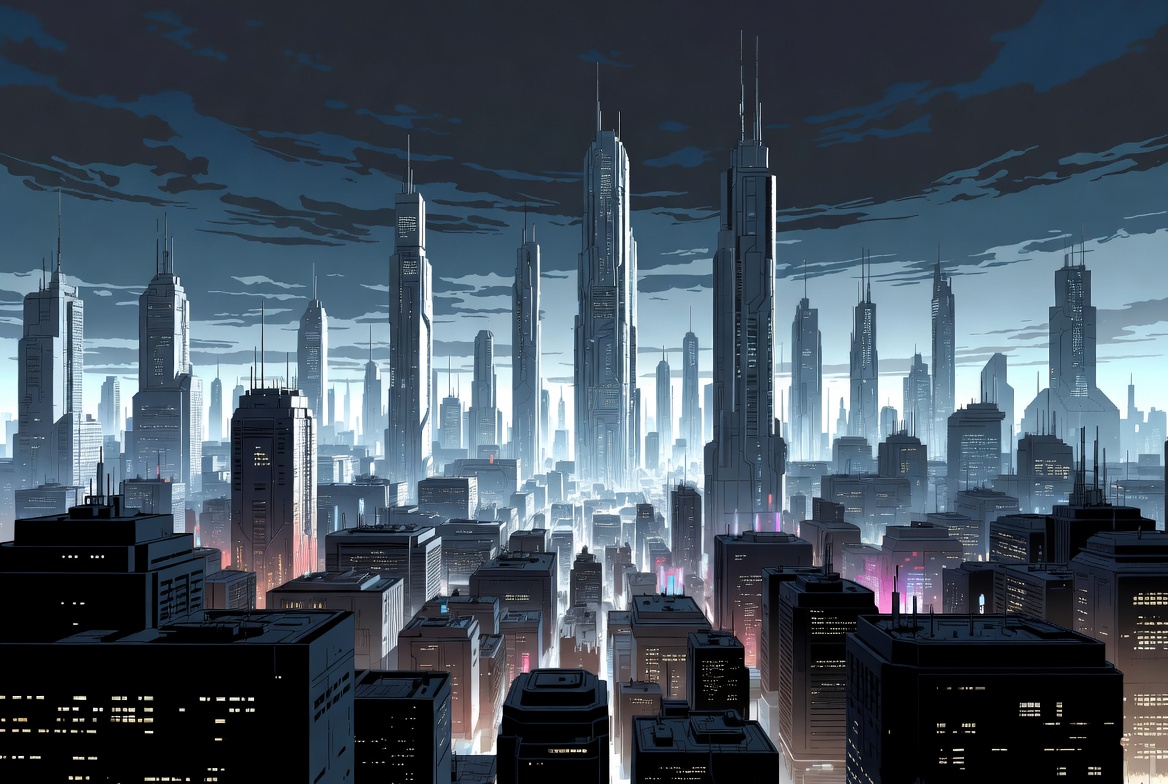 anime style, blue hues, city lights, cityscape, clouds, cyberpunk art, dark atmosphere, dense city, digital art, dramatic lighting, dystopian city, futuristic architecture, futuristic skyline, glowing buildings, high-rises, illustration, metropolis, modern metropolis, neon lights, night sky, pink glow, sci-fi city, skyline view, skyscrapers, towering buildings, urban landscape, vibrant neon, cyberpunk city