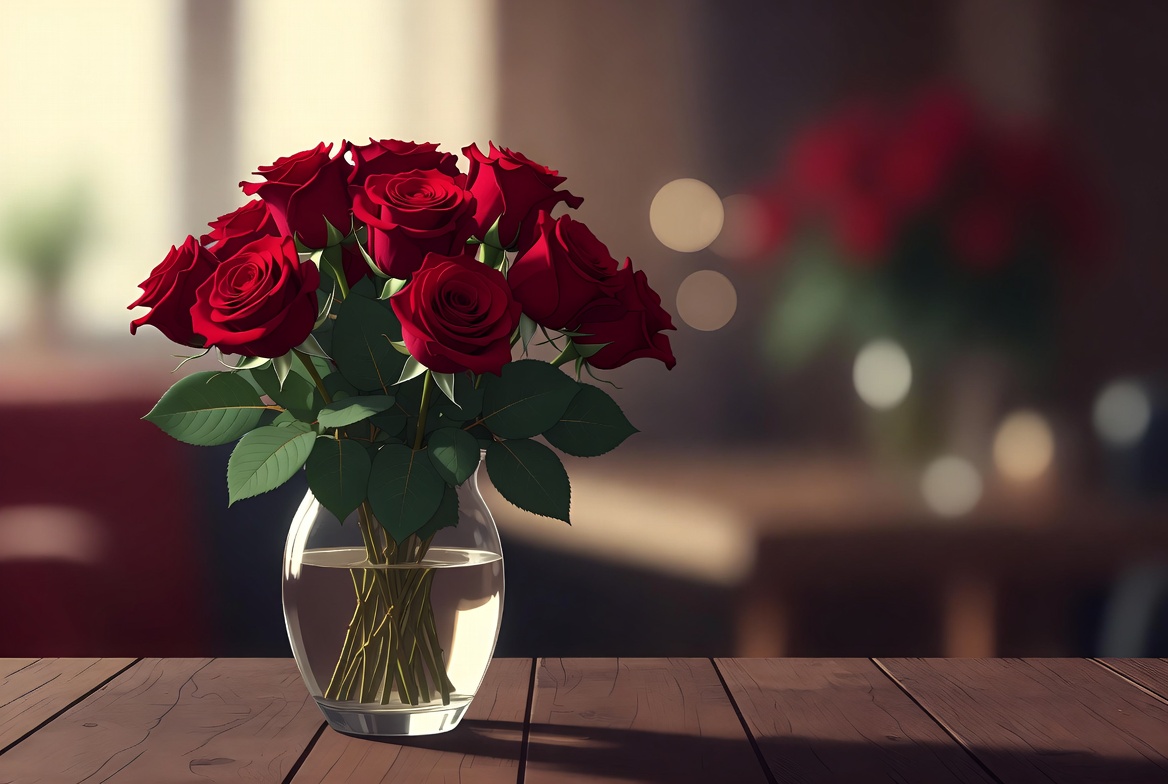 blurred background, bokeh, bouquet, close-up flowers, elegant floral, floral arrangement, flowers, fresh roses, glass vase, green leaves, indoor, luxury bouquet, petals, romantic flowers, roses, still life, vibrant red, water vase, wooden table, red roses