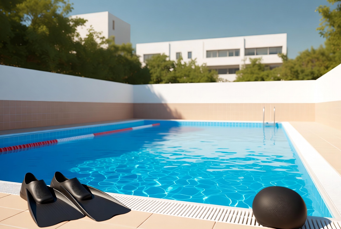 Black swim flippers and a black ball sit on the tiled edge of a bright blue swimming pool. The pool features red lane dividers and metal ladders, surrounded by white walls and lush green trees. A modern white building is visible in the background under a clear sky.