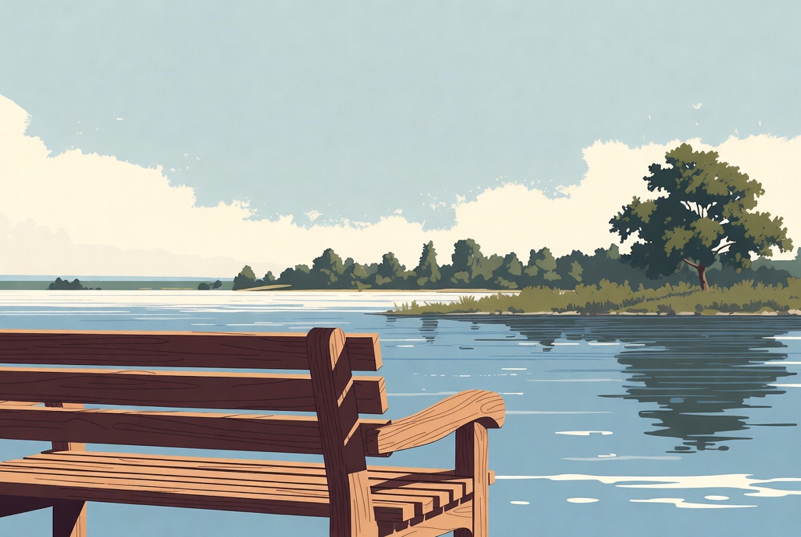 A wooden bench sits facing a calm lake with gentle ripples on the water surface. Lush green trees and grassy areas line the shoreline under a partly cloudy sky. The scene is rendered in a flat illustration style with vibrant colors.