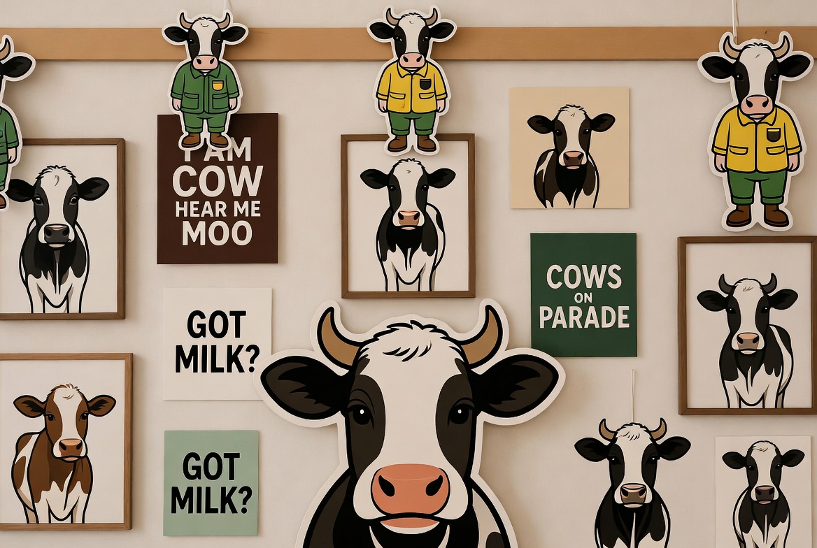 A colorful wall display features multiple cartoon cows in frames and cutouts with humorous signs like 'Got Milk?', 'I Am Cow Hear Me Moo', and 'Cows Parade'. The cows are depicted in various styles, some wearing green and yellow outfits, arranged on a light wooden background. Prominent black and white cow illustrations stand out with bold text overlays.