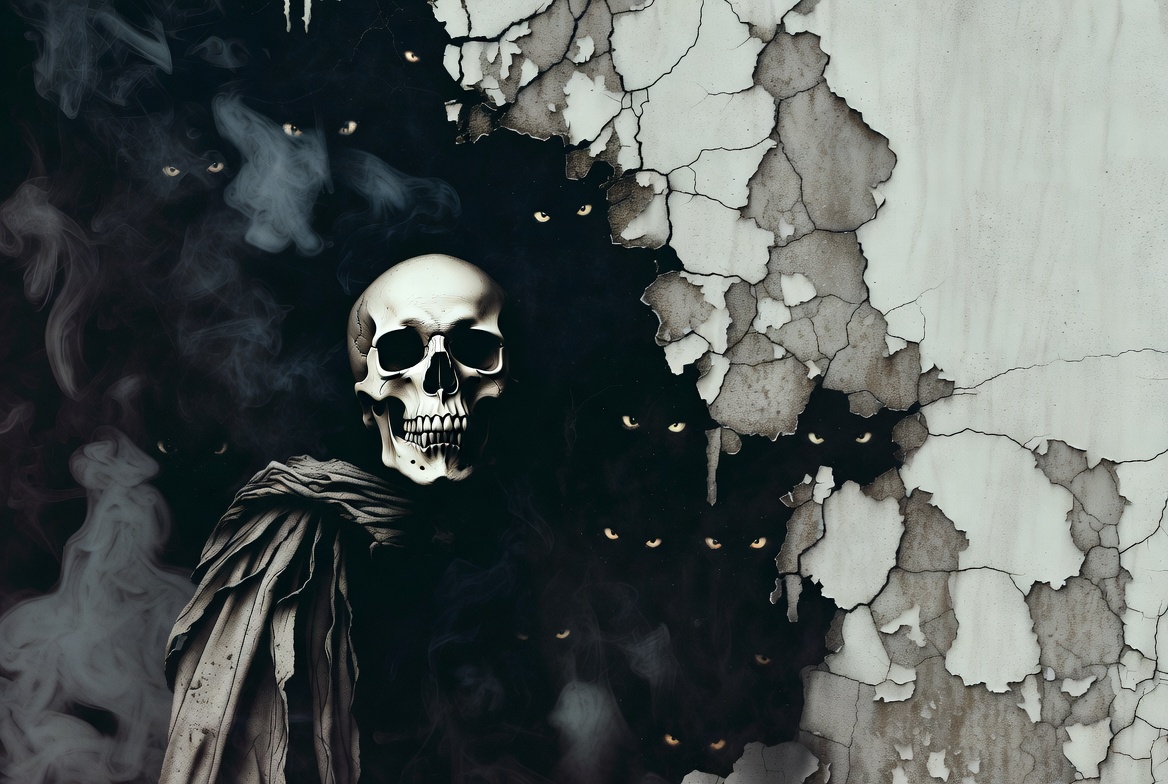 A realistic human skull with a draped cloth garment emerges from dark smoke against a cracked white wall. Subtle eyes glow faintly in the shadowy background. The composition features high contrast between the dark skull and peeling plaster textures.