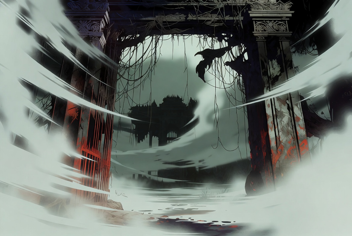 abandoned structure, ancient ruins, birds, decayed architecture, digital art, eerie entrance, fantasy landscape, illustration, misty atmosphere, overgrown vines, ravens, red banners, spiderwebs, stone archway, swirling fog, temple background, ruined gate