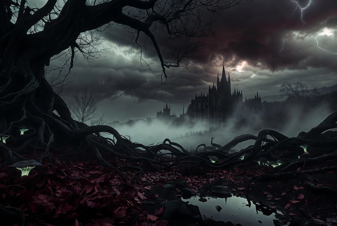 barren trees, castle spires, cloudy sky, dark castle, dead trees, digital art, dramatic lighting, eerie atmosphere, fantasy landscape, fog, green glow, haunted castle, illustration, lightning storm, medieval fortress, mist, mystical fog, night scene, puddles, red leaves, spooky scenery, stormy night, thunder, twisted roots, gothic castle