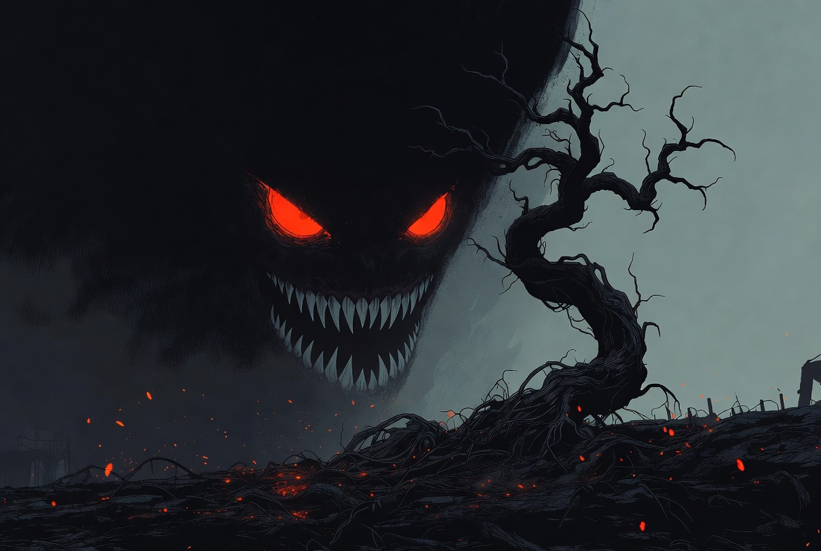 Halloween, barren tree, creepy, dark background, demonic face, digital art, evil, fantasy, fence, fiery glow, foggy, glowing embers, horror, illustration, monster, night, ominous, red eyes, roots, shadow, sharp fangs, silhouette, spooky, supernatural, twisted tree, demon