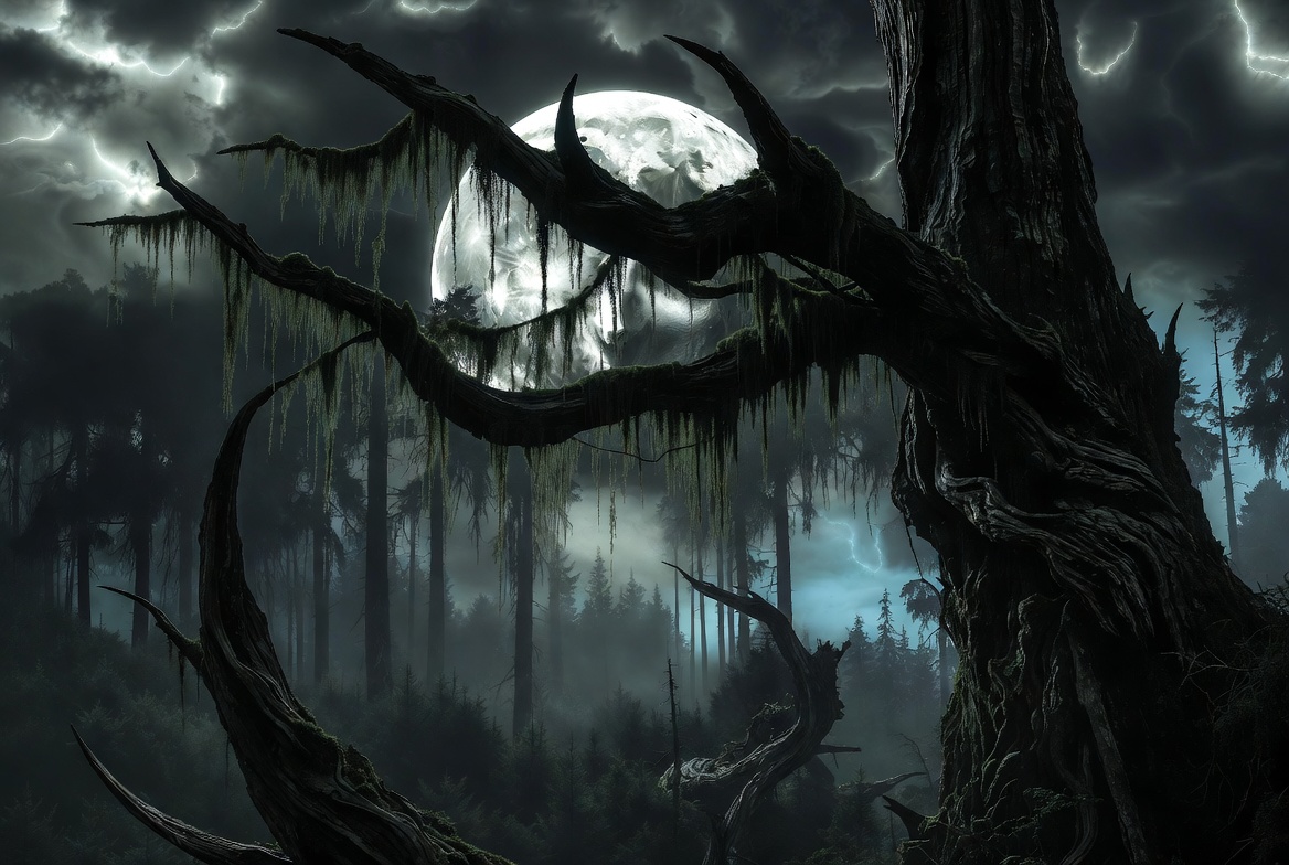 ancient trees, atmospheric landscape, creepy woods, dark forest, digital art, eerie landscape, foggy woods, forest night, gnarled trees, hanging moss, horror scene, illustration, lunar glow, moonlight, moonlit forest, mossy branches, mystical woods, night sky, ominous sky, pine trees, silhouette trees, spooky forest, stormy clouds, twisted trees, full moon