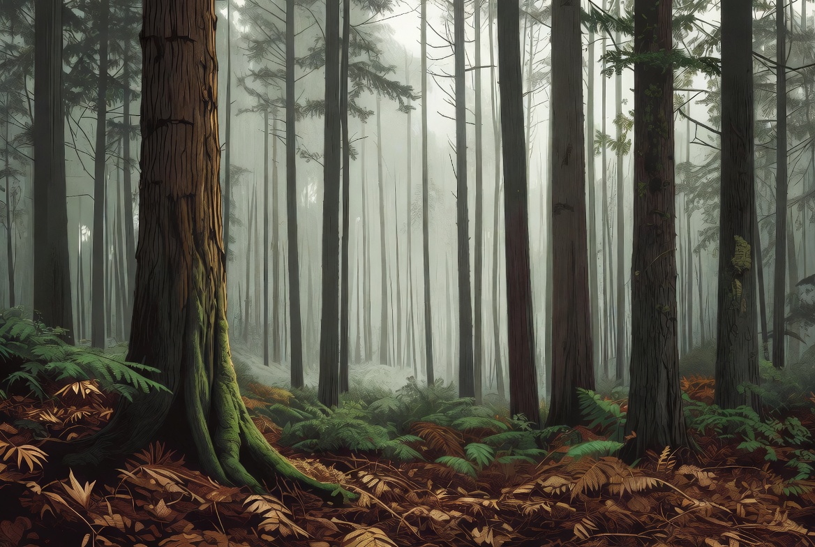 A dense forest features tall evergreen trees with thick trunks covered in moss and ferns. A thick mist permeates the scene, creating an ethereal atmosphere among the towering pines. Fallen leaves and undergrowth cover the forest floor.