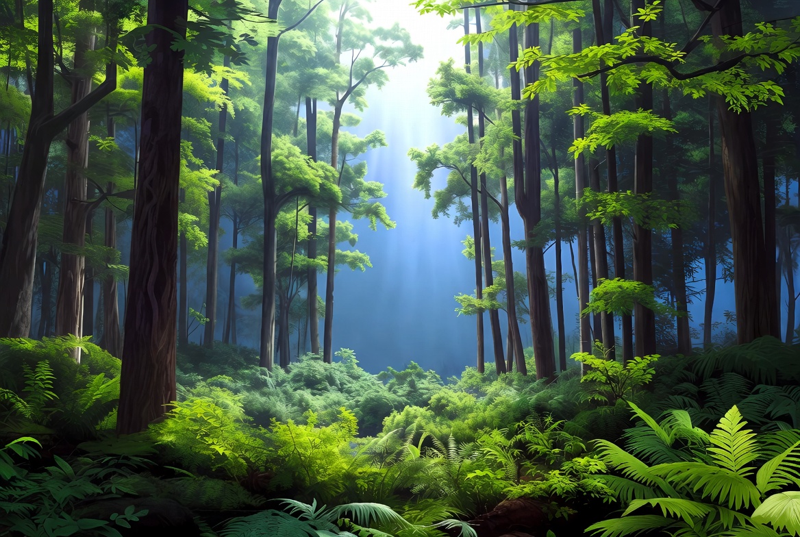 A vibrant digital illustration depicts a dense forest with tall trees and lush green ferns covering the ground. Sunlight beams filter through the canopy, casting rays of light in shades of gold and blue. The scene features intricate details on bark textures and foliage.