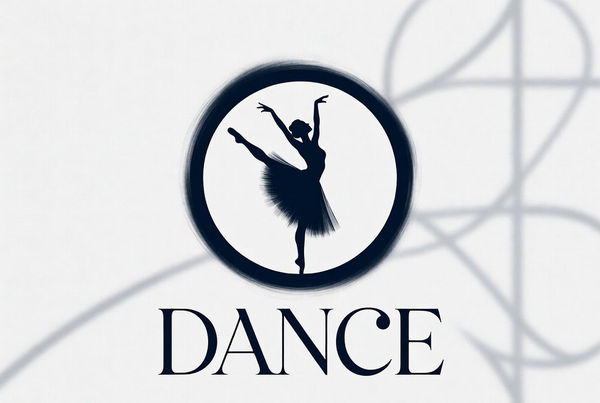 A black silhouette of a ballerina in a tutu performs a graceful pose inside a thick black circle. The word 'DANCE' is boldly written below in white capital letters. Subtle white curved lines and a blurred effect appear on the light background.