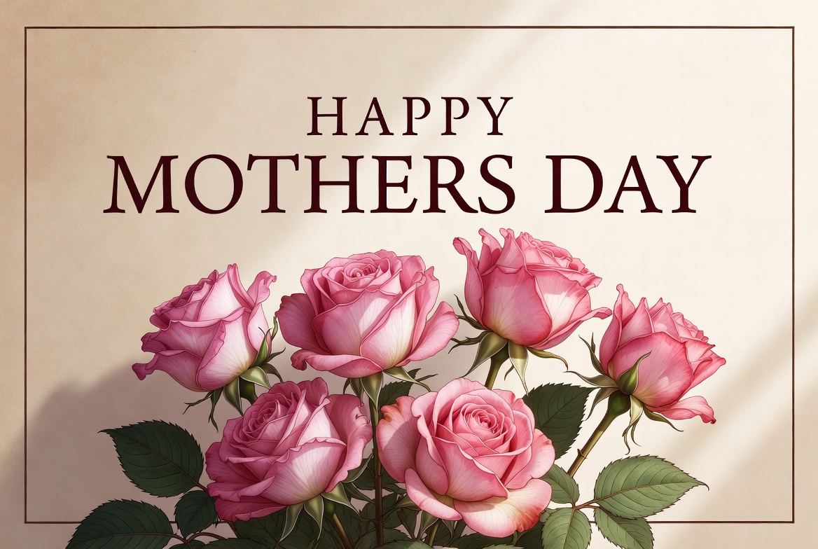 beige background, bouquet, card, celebration, floral arrangement, flowers, green leaves, greeting card, happy mothers day, holiday, illustration, isolated background, mothers day, roses, pink roses