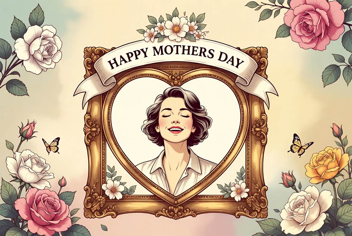 A vibrant illustration features a smiling woman with short wavy hair framed in an ornate gold heart-shaped frame. She wears a white collared shirt and smiles warmly. Surrounding the frame are colorful roses, white daisies, butterflies, and a banner reading 'Happy Mother's Day' on a soft beige background.