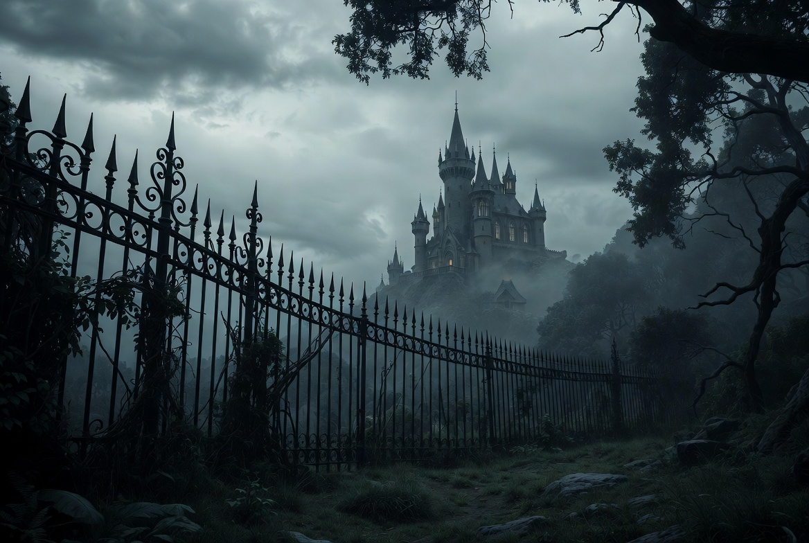 A tall, dark gothic castle with multiple spires looms behind an ornate black iron fence under a stormy sky. Twisted trees and mist surround the scene, with grass and rocks in the foreground. The castle is illuminated faintly, creating a mysterious atmosphere.