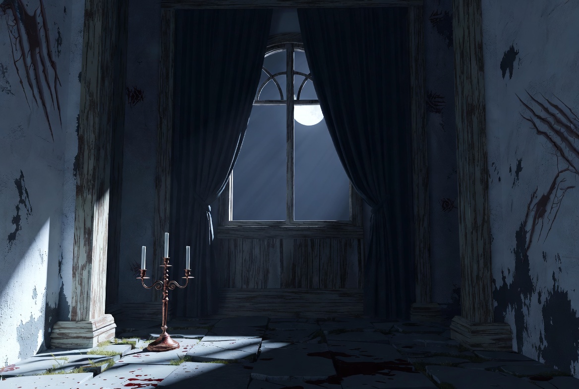 abandoned building, arched window, bloodstains, brass candelabra, candelabra, claw marks, cracked walls, dark interior, debris floor, eerie atmosphere, full moon, gothic architecture, horror scene, lit candles, moonlight window, night scene, rundown balcony, tattered curtains, wooden pillars, haunted room
