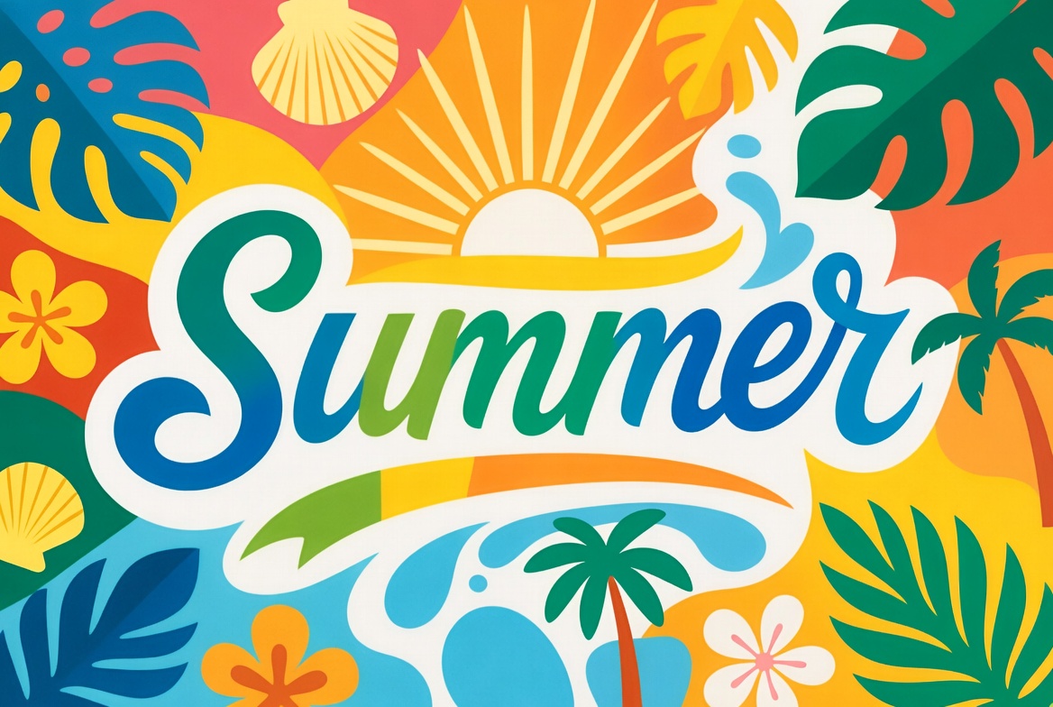 A vibrant illustration features the word 'Summer' in bold, multicolored letters at the center. Surrounding it are tropical palm trees, green leaves, seashells, a bright sun, ocean waves, and colorful flowers on an isolated background. The design uses a playful mix of pink, yellow, green, blue, and orange hues.
