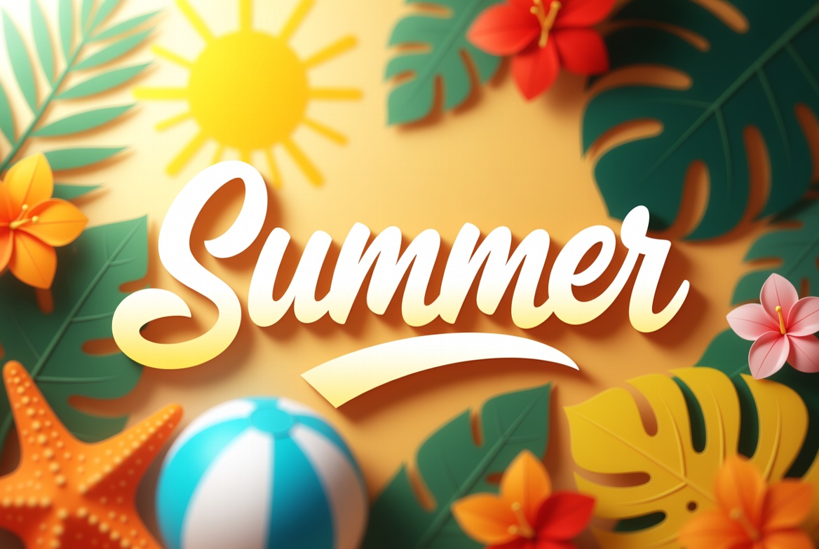 A vibrant paper-cut style illustration features the word 'Summer' in elegant white script lettering on a yellow background. Surrounding it are green palm leaves, colorful hibiscus flowers, a bright yellow sun, a white-and-blue beach ball, and a pink starfish. The design uses layered cutouts in tropical colors for a summery effect.