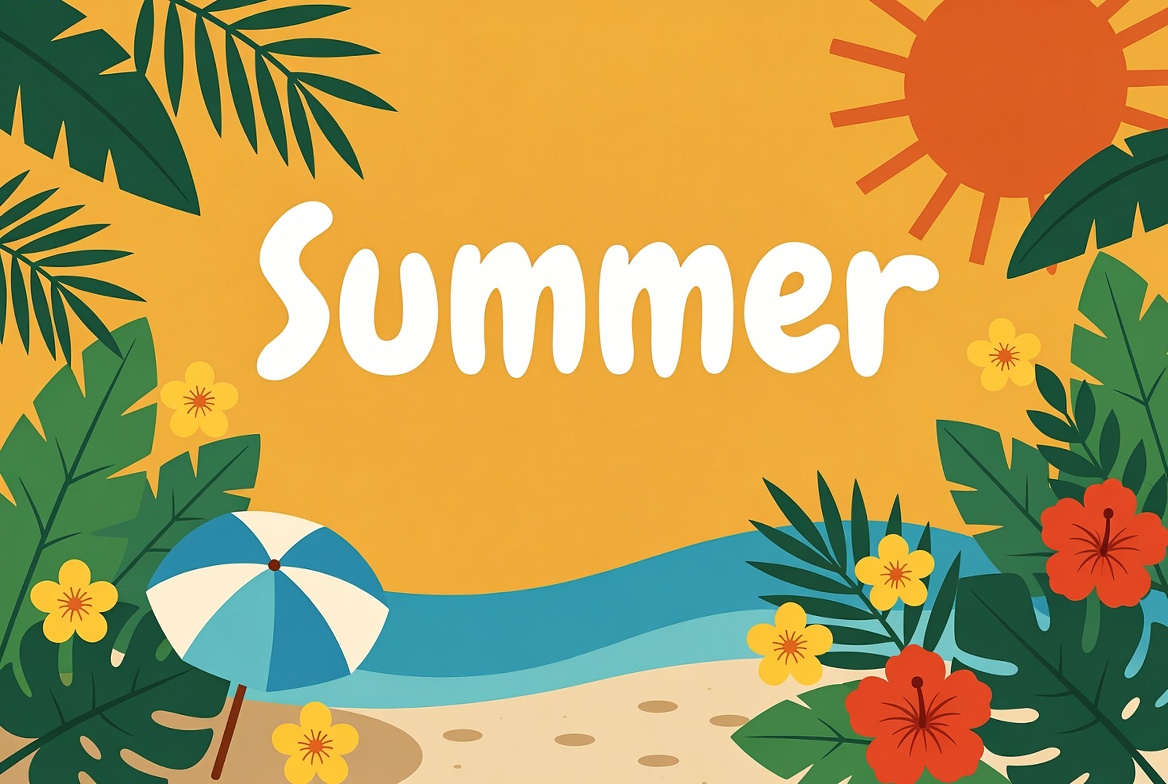 A vibrant illustration features the word 'Summer' in large white letters on a yellow background. It includes a bright sun, green palm leaves, yellow flowers, red hibiscus, a blue beach umbrella, sandy beach, and blue ocean waves. The design is colorful and tropical with clipart-style elements.