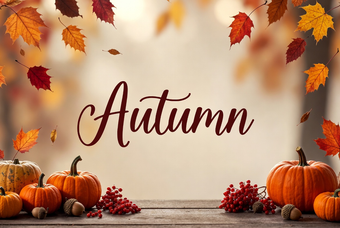 A rustic wooden surface holds an assortment of orange pumpkins, small gourds, red berries, and acorns. Vibrant orange and red autumn leaves fall gently against a blurred warm background. Elegant cursive text 'Autumn' is centered prominently above the arrangement.