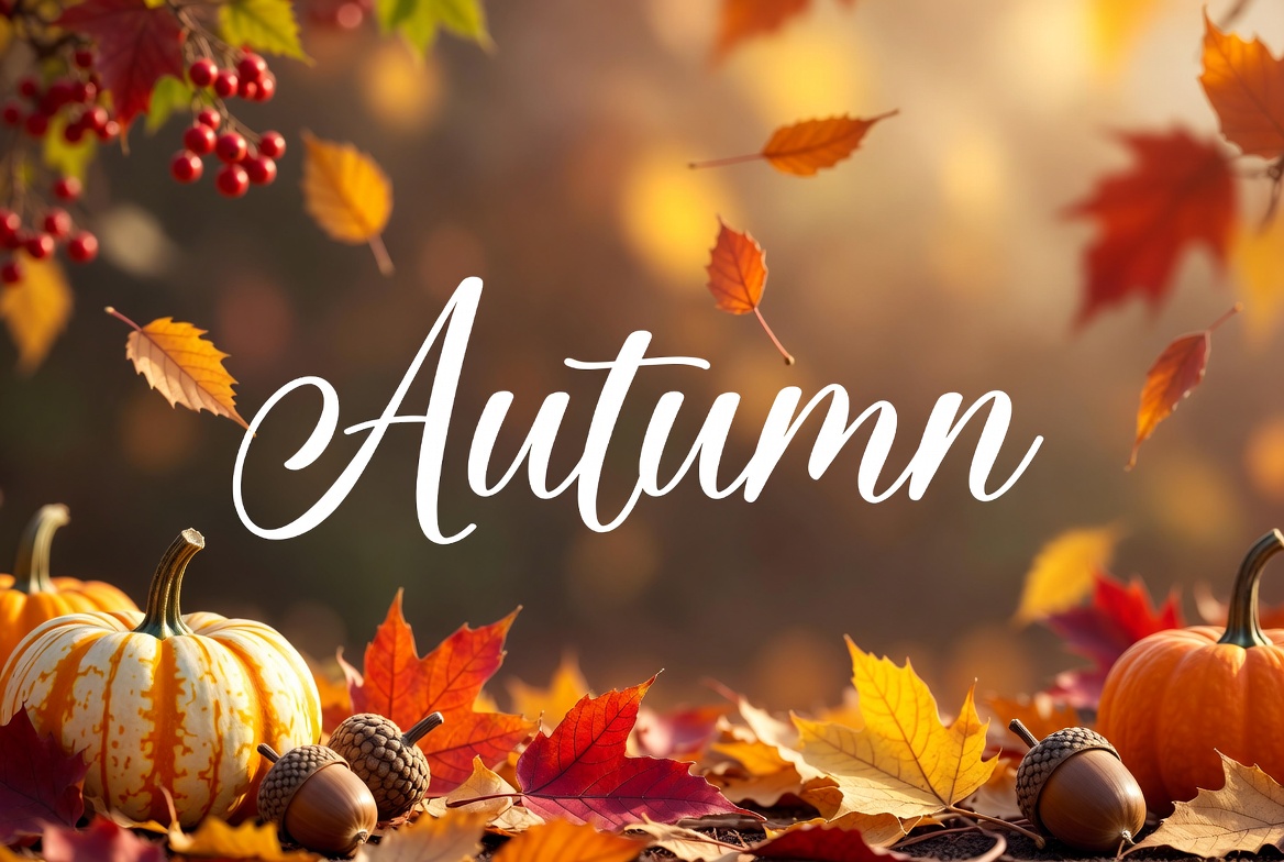 A vibrant autumn scene features scattered orange pumpkins, white pumpkins, acorns, and colorful falling leaves in shades of red, orange, and yellow. The elegant word 'Autumn' is scripted in white across the blurred bokeh background. Red berries add accents to the festive fall composition.